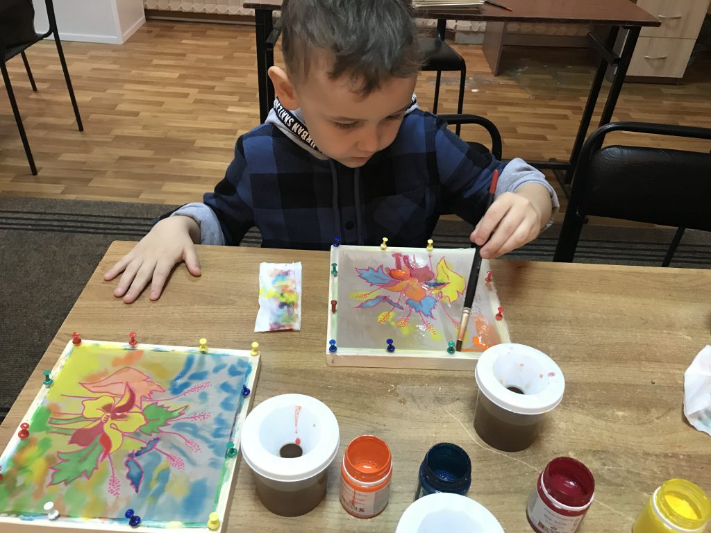 🎨 Однотонную ткань натянули на деревянную раму и расписали по заранее подготовленному рисунку. Во время работы использовались профессиональные красители для росписи шелка. Каждый цветок был наполнен любовью, нежностью, теплотой и добротой. Ребята очень старались, всем хотелось, чтобы именно его мама получила к празднику самый красивый подарок, созданный своими руками.